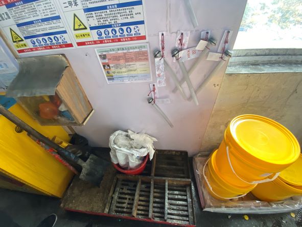 浙江宏竹塑膠五金有限公司生產過程中涉及的危險化學品主要分溶劑類、膠粘劑類和液體噴劑類。溶劑類危險化學品分別為油墨、天那水、乙醇、抹字水、洗網(wǎng)水、稀釋劑、PP水,主要使用于產品裝配時表面擦拭、印刷產品、網(wǎng)版擦拭及油墨稀釋。膠粘劑類危險化學品分別為MEK膠水、萬能膠、AB膠,主要使用于產品裝配時的塑膠軟管粘接、塑膠硬管粘接及金屬管與塑膠管粘接。液體噴劑類危險化學品分別為脫模劑、防銹劑、清洗劑、防卡耐磨劑,主要使用于模具保養(yǎng)、機械保養(yǎng)。危險化學品儲存場所為二號車間西北角的危險化學品中間倉庫。