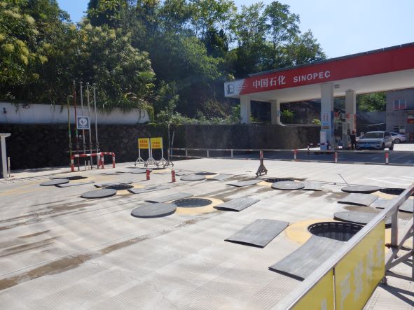 加油站設(shè)置汽油卸油和加油油氣回收系統(tǒng)。加油區(qū)設(shè)置加油罩棚,罩棚為混凝土框架結(jié)構(gòu)罩棚。罩棚下設(shè)置4臺雙油品雙槍自吸式加油機(汽油加油槍帶油氣回收);埋地油罐區(qū)設(shè)有4只30m³埋地臥式單層鋼制油罐(油罐均為車道罐,設(shè)置在承重防滲罐池內(nèi)),其中2只30m³汽油罐(分別儲存92#汽油和95#汽油),2只30m³柴油罐(儲存0#柴油),折合油罐總?cè)莘e為90m³(柴油罐容積折半計入),根據(jù)《汽車加油加氣加氫站技術(shù)標(biāo)準》GB50156-2021的相關(guān)規(guī)定,該加油站為三級加油站。