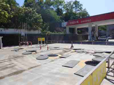加油區設置加油罩棚,罩棚為混凝土框架結構罩棚。罩棚下設置4臺雙油品雙槍自吸式加油機(汽油加油槍帶油氣回收);埋地油罐區設有430m³埋地臥式單層鋼制油罐(油罐均為車道罐,設置在承重防滲罐池內),其中230m³汽油罐(分別儲存92#汽油和95#汽油230m³柴油罐(儲存0#柴油),折合油罐總容積為90m³(柴油罐容積折半計入),根據《汽車加油加氣加氫站技術標準》GB50156-2021的相關規定,該加油站為三級加油站。
